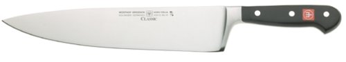 This is an exceptional knife and one that many professionals are pleased to own. It has a gently bowed 10-in. cutting edge that is wider than a standard cook's knife. The extra 0.25-in. of knuckle clearance supplies enough razor-sharp surface to make short work of mincing herbs or julienning carrots, while its heft provides ample power fo